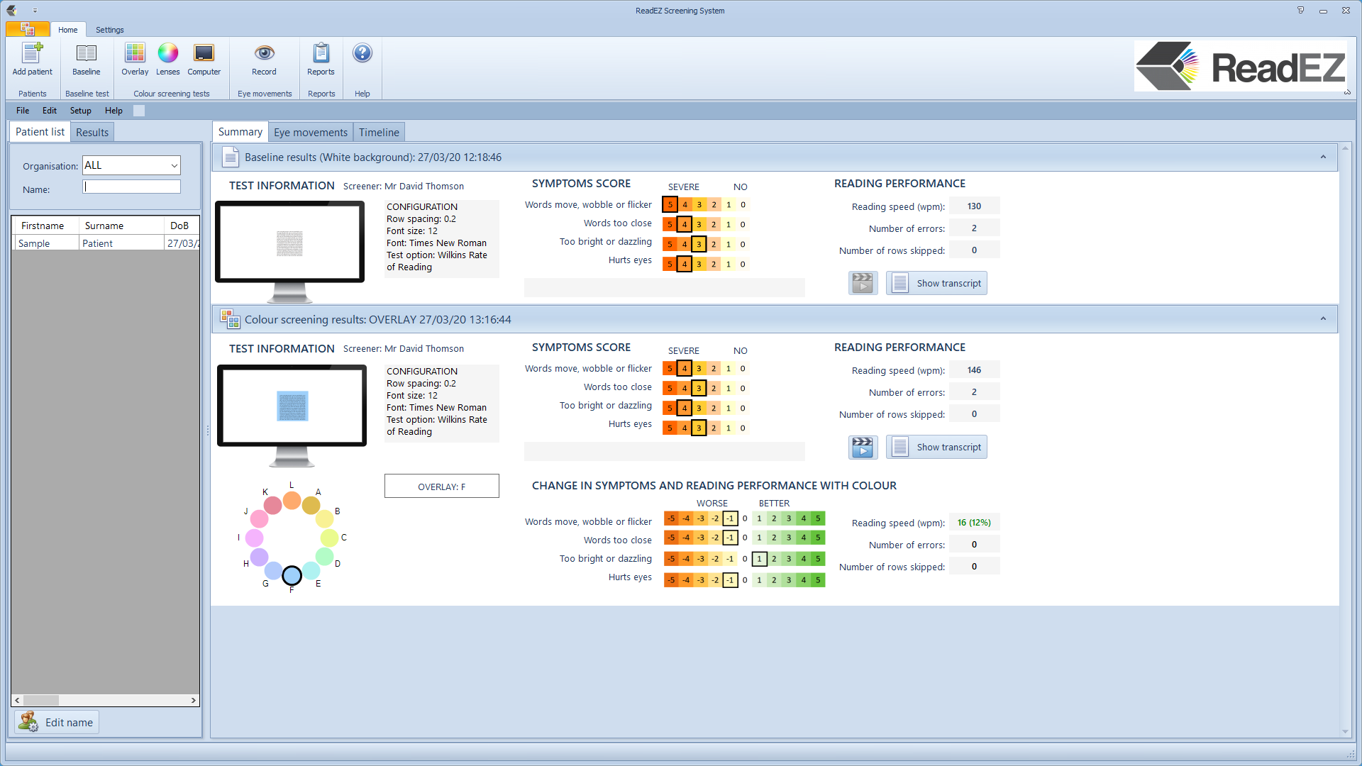 The Results screen is designed to allow the clinician to rapidly assess if a patient benefits from colour and which colour is preferred for Overlays, Coloured lenses and a Computer screen.