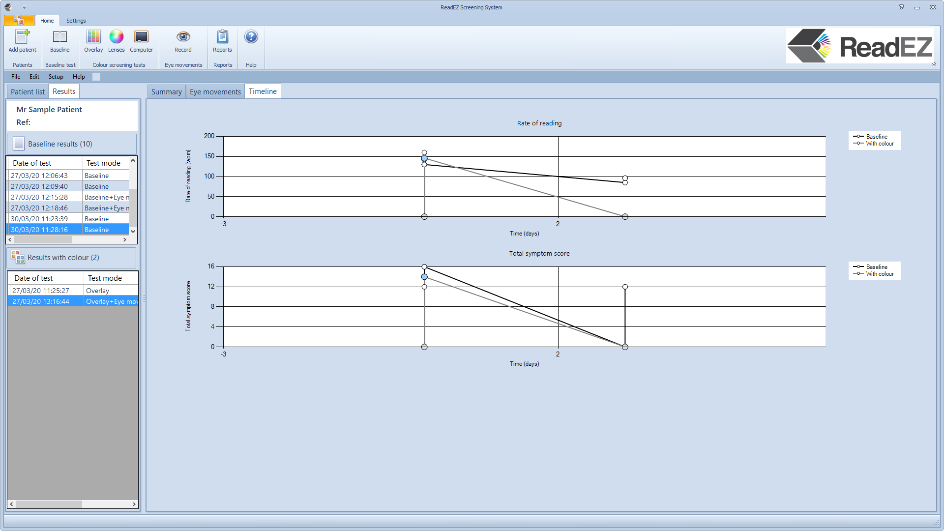 Selecting the Timeline tab display a timeline for the Rate of Reading and Symptoms. This allows the practitioner to assess how reading performance and symptoms have changed over a period of time. Each graph shows the Baseline results (empty circles and black line) and results with the optimum colour (circle showing preferred colour and grey line).