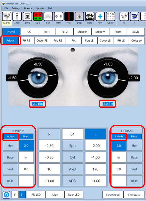 NOTE: The prism will not be incorporated into the phoropter until the Include button is selected. In addition to the button being highlighted, the current prism value in each eye will be shown on the visualisation (see below). This allows prisms to be incorporated instantly in front of both eyes if required.