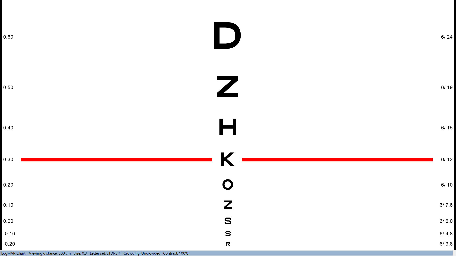 In LogMAR mode, pressing the I key again displays two letters, then 3 letters until all five are shown again. Pressing Esc restores the chart to to 5 letters/row.