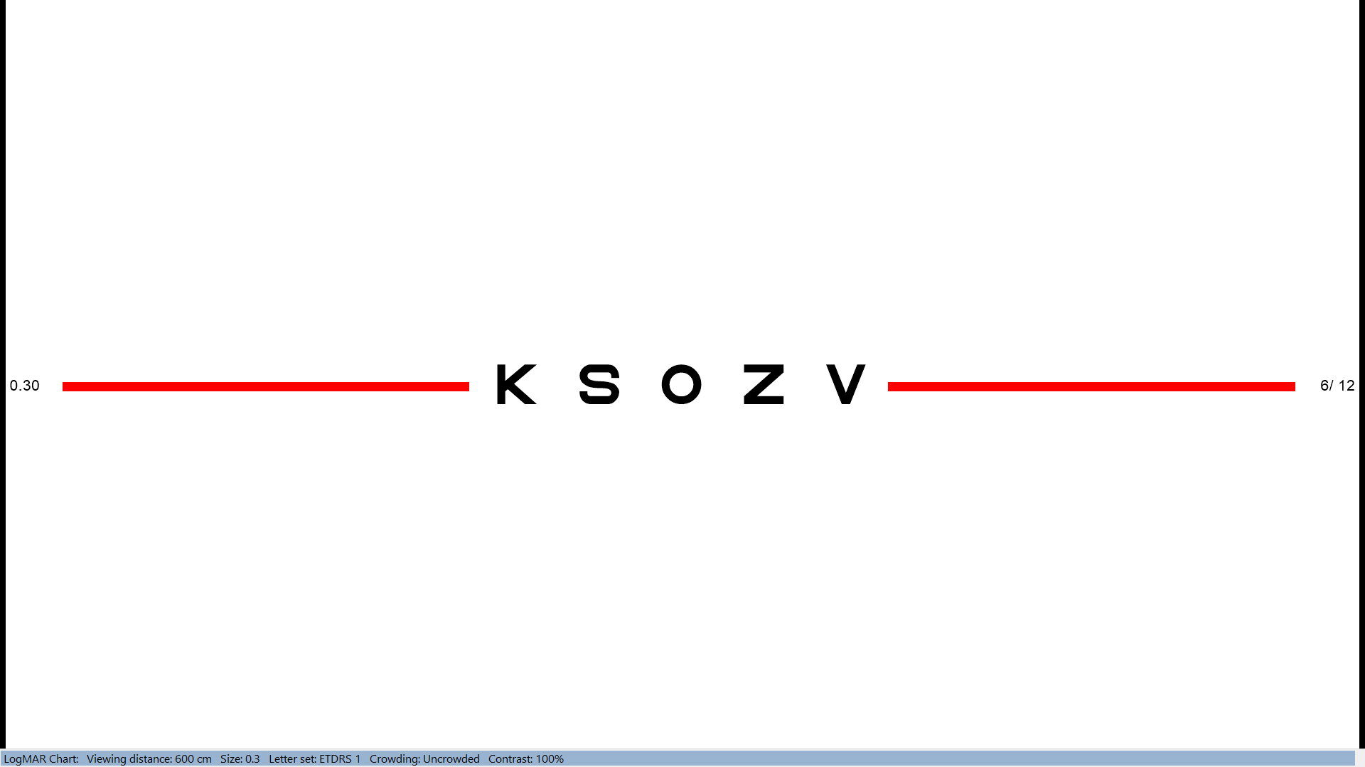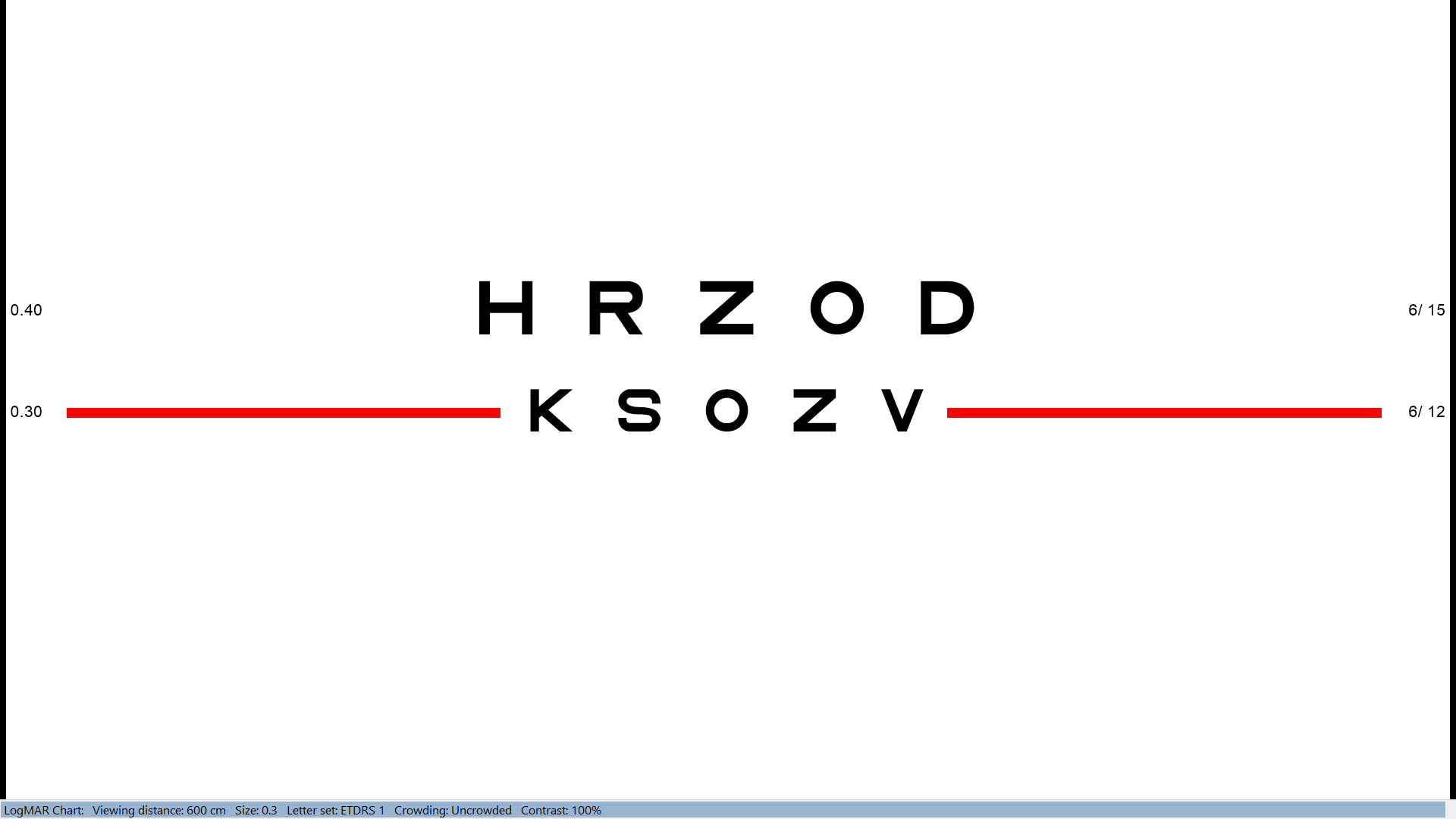 By default, the Thomson Test Chart will display as many rows as will fit on the screen. However, it is sometimes useful to isolate one or two rows particularly when testing children. The Thomson Test Chart is able to isolate 1 row with crowding, and 1 , 2, 3 or 4 rows without crowding bars as shown below: