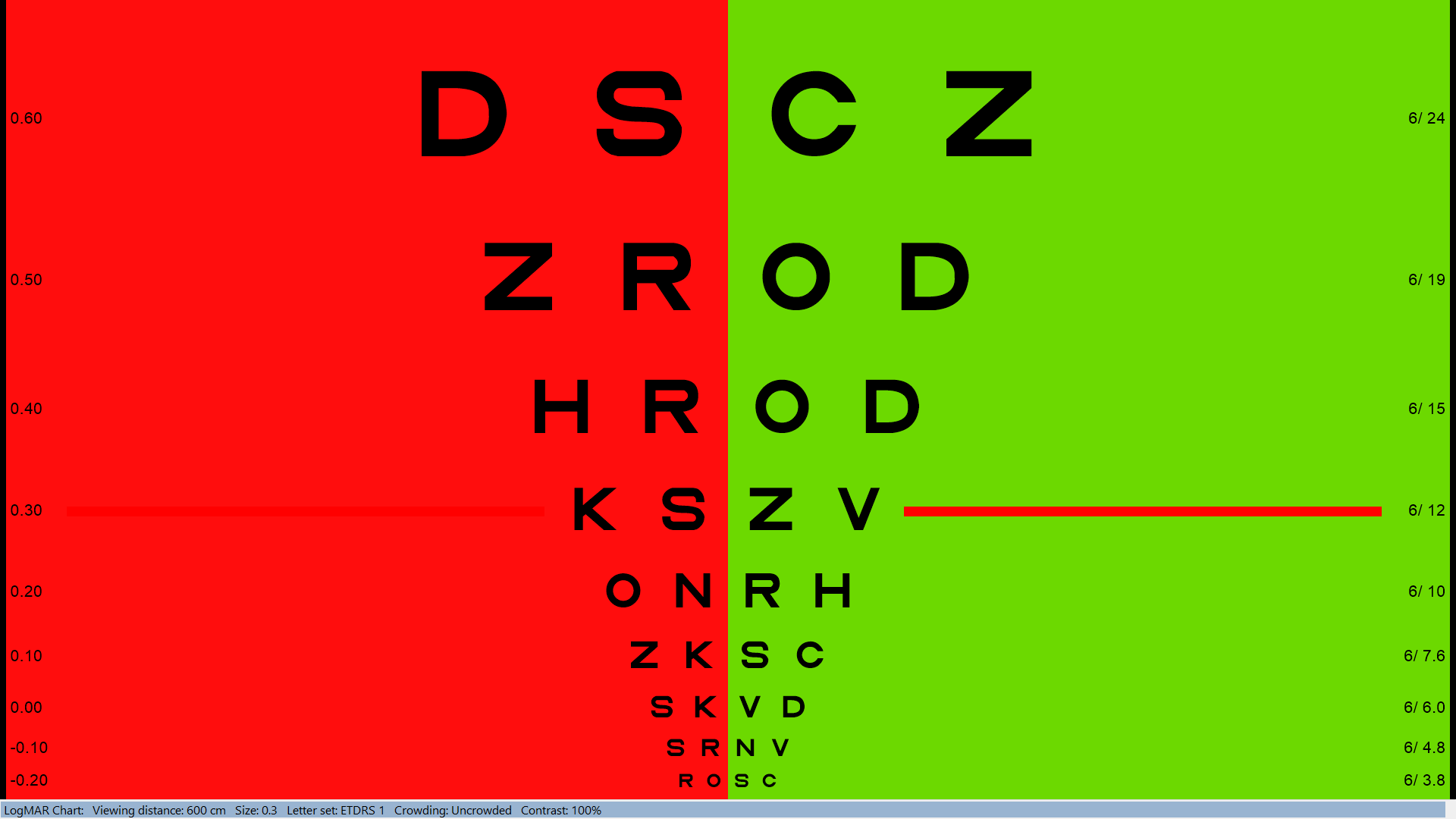 A duochrome split may be superimposed on the LogMAR and Snellen charts as shown below. In LogMAR mode
