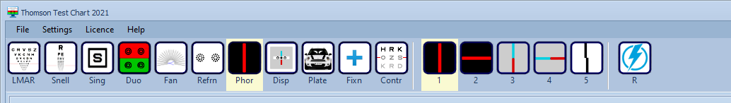 To implement this test on a computer screen it is necessary to use a bar instead of a spot in order to achieve adequate brightness. The colour of the bar can be changed from the Settings screen. Best results are obtained if the bar is matched in colour to the Maddox rod – i.e. a red bar for a red Maddox rod.