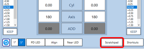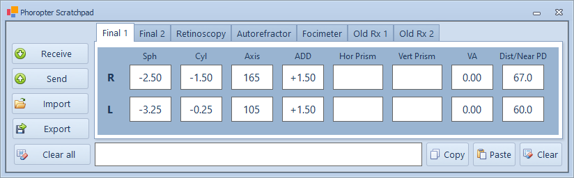 The Prescription Scratch-pad provides a prescription memory space so that different prescriptions can be readily sent and received to/from the phoropter. The Scratch-pad is also used to import and export prescriptions from a Patient Management System.