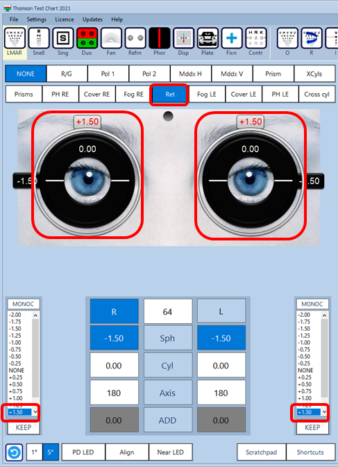 Selecting the Ret button inserts plus lenses in front of both eyes as shown below.