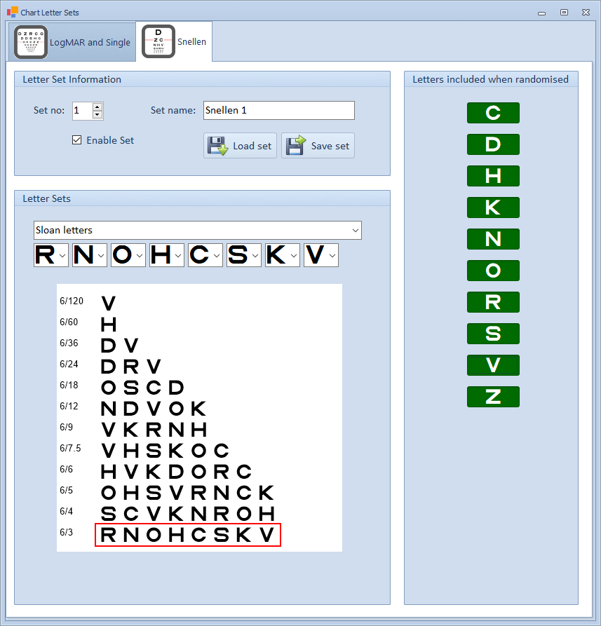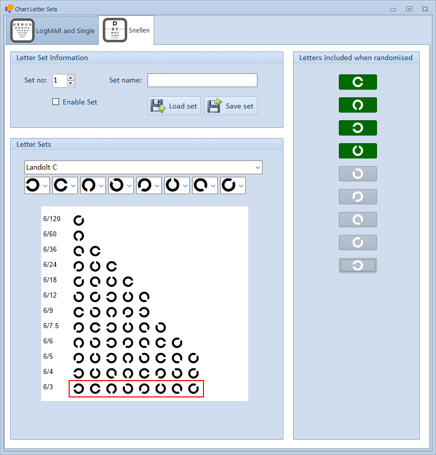 Having defined a set of letter/optotypes for a Snellen chart, this can be saved by selecting Save set in the Letter Set information panel. This file may then be copied to another computer so that the same set can be loaded using the Load set option.