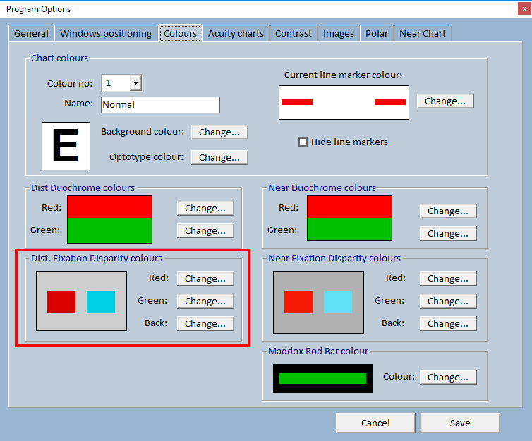If a non-polarised monitor is being used, the patient wears a RED filter in front of the RIGHT eye and a GREEN filter in front of the LEFT eye for all tests in this group. The software is supplied with a pair of red/green visors but users may prefer to use the red and green filters in their trial set or phoropter.