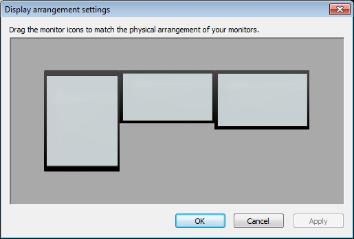 This shows the arrangement of the Tablet and the two monitors attached to the PC. The monitors and tablet effectively become one large desktop so that a the mouse cursor moves off the edge of one screen it appear on another. The arrangement of the Tablet and the two monitors can be changed by simply dragging the monitor icons to a new position. It is usually best for the Tablet to be to the right or the left of the other two monitors.