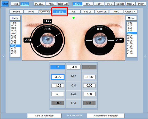 The default power of the fogging lens can be selected from the Phoropter tab or the Program Options window. More information