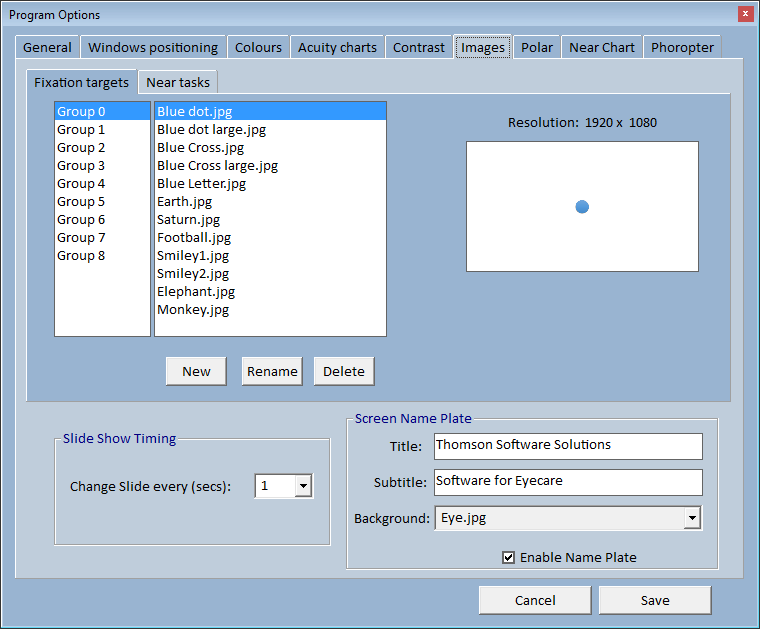 Test Chart 2016 includes a wide range of Fixation targets for use during the cover test, retinoscopy, ophthalmoscopy etc. These images can be easily be changed or additional images added.
