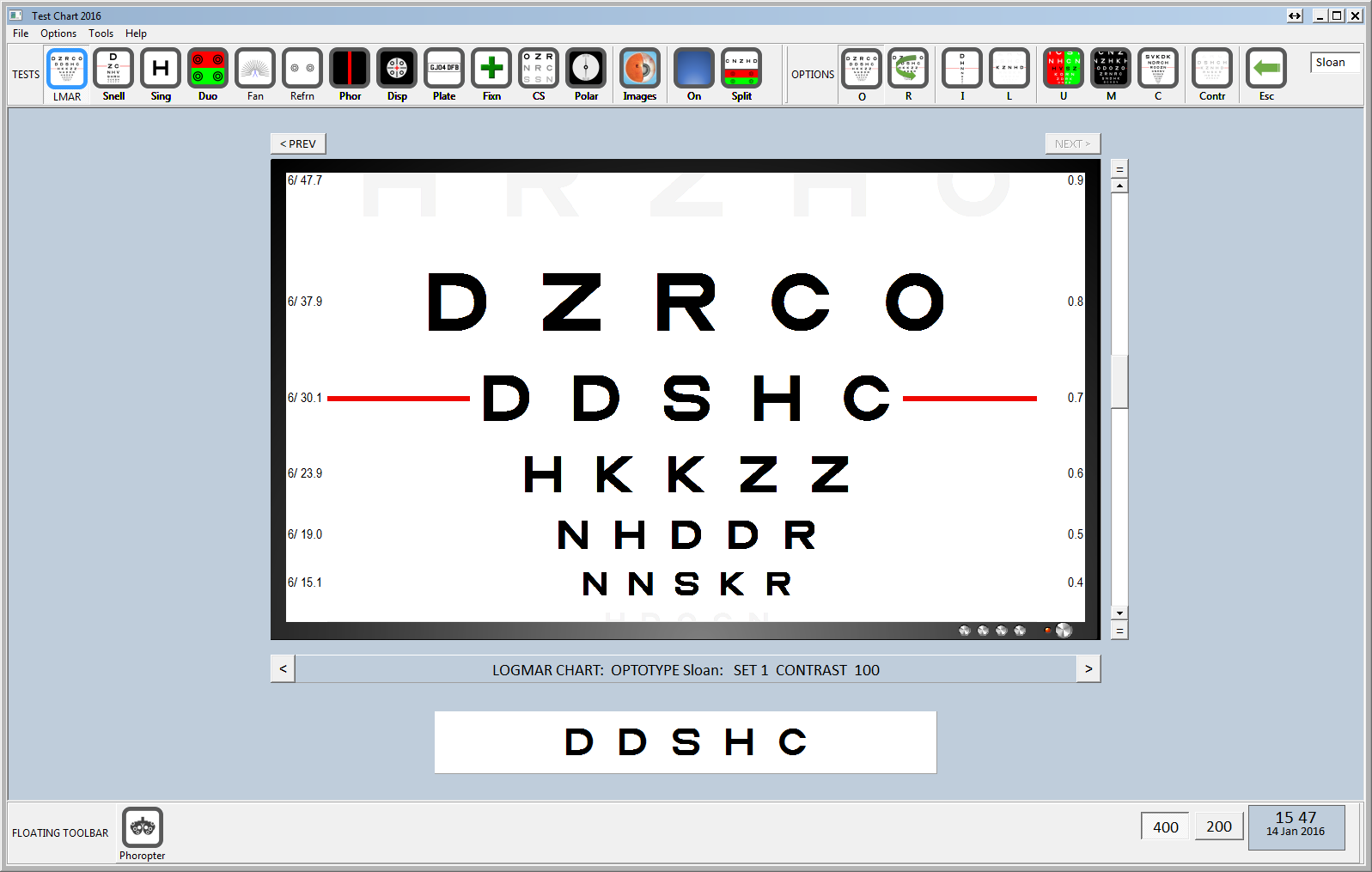 This interface gives simultaneous control over the Test Chart and the Phoropter.