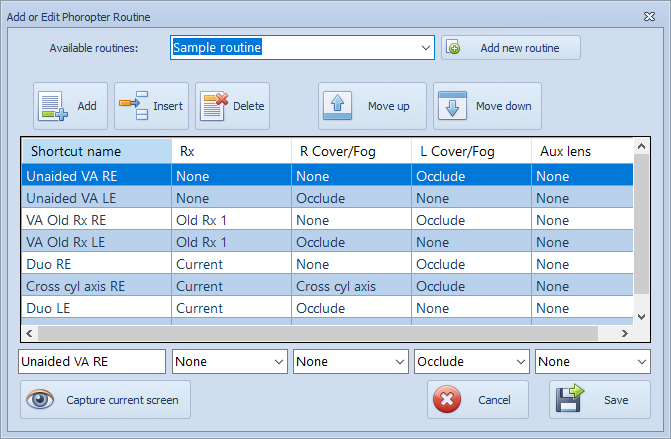 To Add a new Routine or Edit an existing Routine. Select Edit from the Shortcuts panel. This will display the Add or Edit Phoropter Routine window shown below.