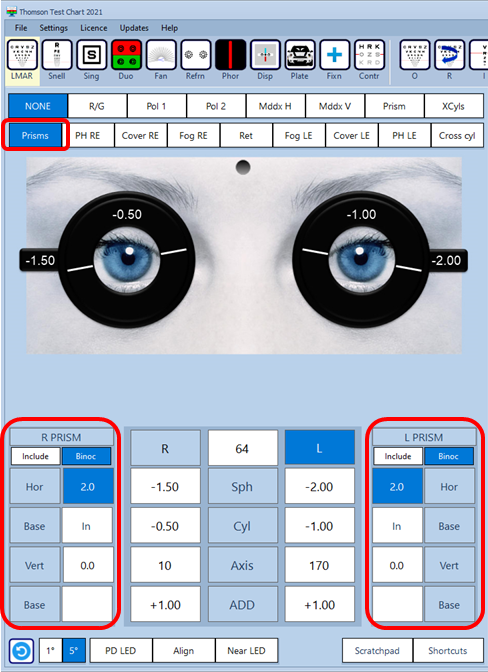 NOTE: The prism will not be incorporated into the phoropter until the Include button is selected. In addition to the button being highlighted, the current prism value in each eye will be shown on the visualisation (see below). This allows prisms to be incorporated instantly in front of both eyes if required.