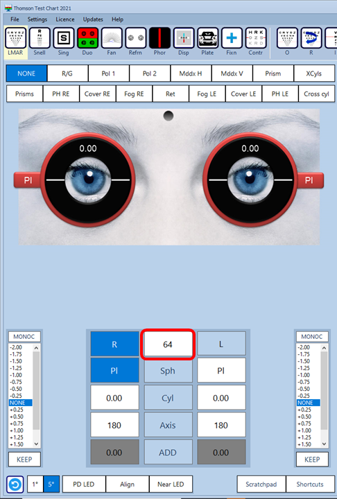 Selecting the box will turn on the PD LED and insert a graticule lens (Align) in front of each eye. The centration distance is changed by simply rotating the mouse wheel until the lenses are aligned with the centre of the pupils.