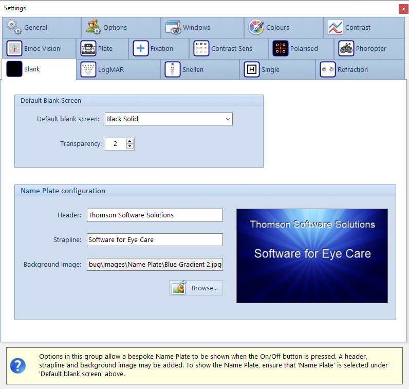 If the Name plate option is selected, a Header and Strap-line is shown against a background image.