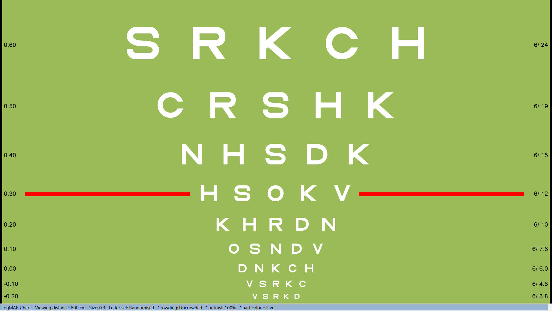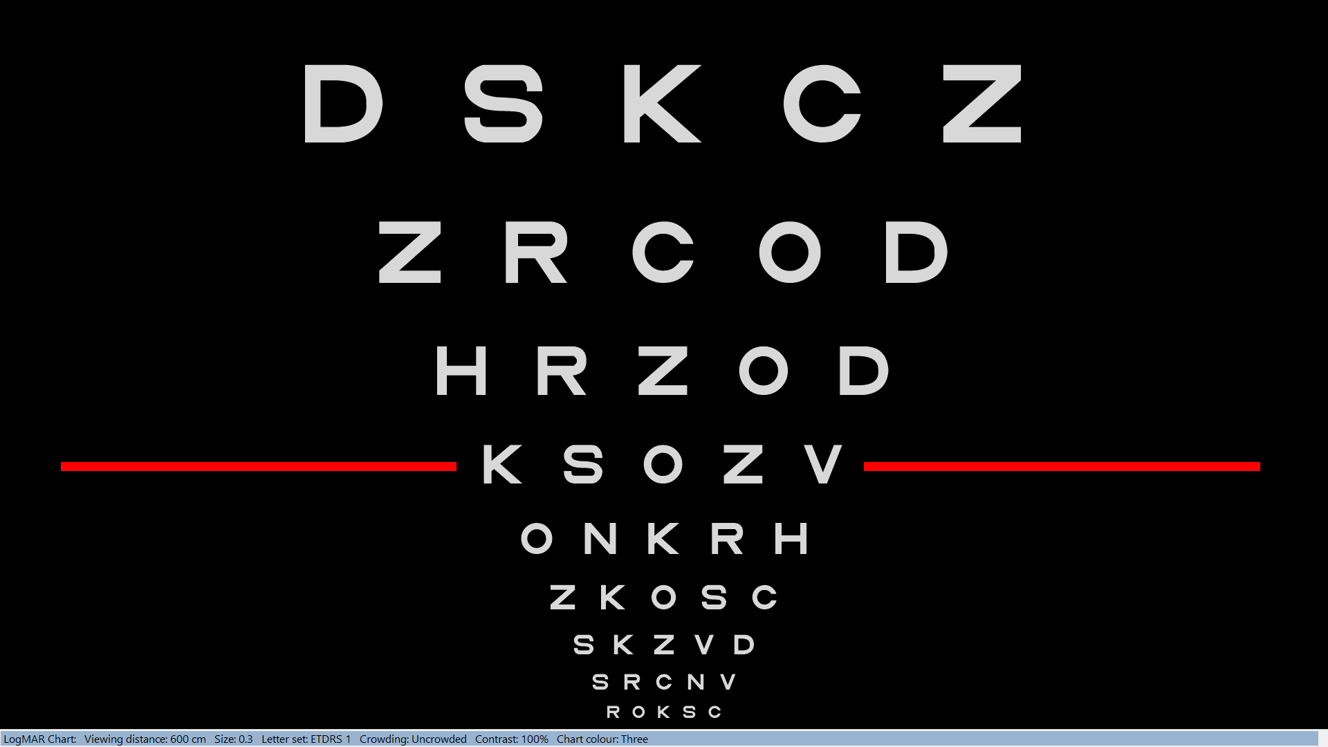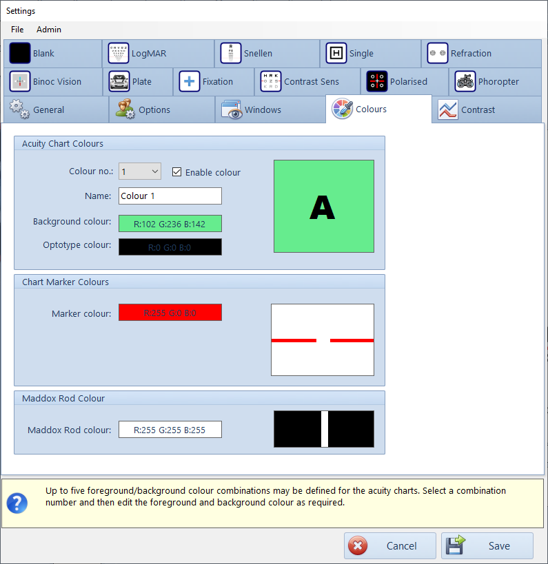 The Thomson Test Chart includes the facility for changing the colour of the optotypes and the background to any colour supported by the computer. The colours are specified from the Settings screen.