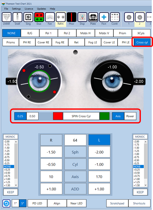 The red and green boxes can be used to change the cyl power and axis automatically by simply clicking on the colour of the preferred cross cyl (shown as a red or green rim to the cross cyl).
