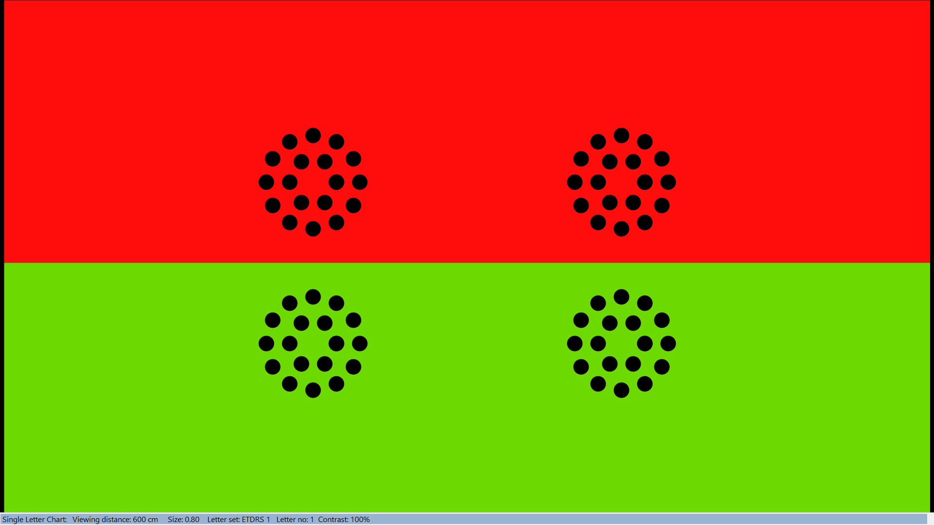 Keyboard Use horizontal cursor control keys to rotate around different duochrome stimuli or press 1, 2 or 3. Use vertical cursor control keys to change the size of the rings, dots or optotypes When optotypes are displayed (mode 3): O Sets chart to default arrangement of optotypes. R Randomise optotypes |