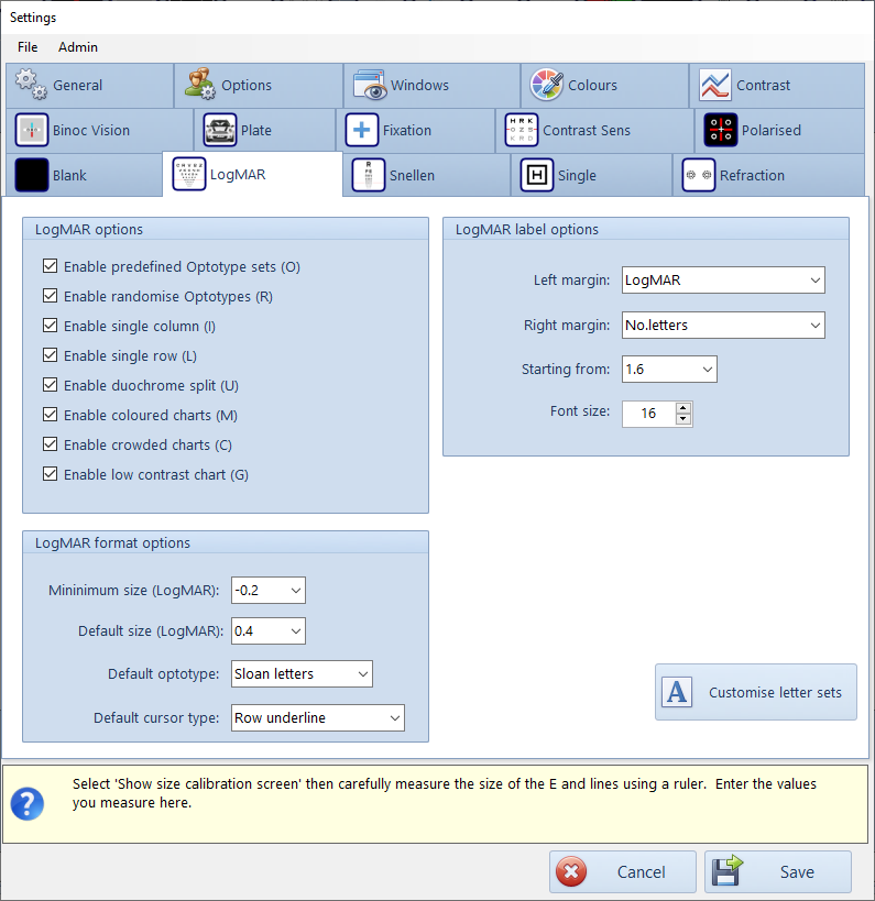 Options in this panel allow the user to specify the Minimum size (LogMAR) (i.e. the smallest LogMAR letters shown on the chart), the default size (i.e. the current LogMAR row after a reset) and the Default optotype (i.e the optotype set after a reset).