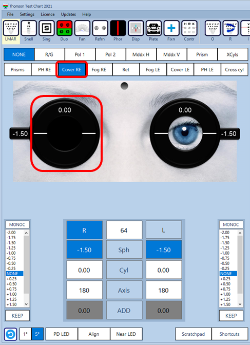 To occlude an eye, either click on the Cover RE or Cover LE buttons or click directly on the visualisation.