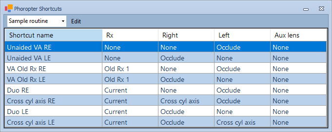 The list shows the routine named Sample routine. Clicking on each item in the list will display the lens combination and Test Chart configuration which has been defined for that item. For example, a Shortcut called VA Old Rx RE could be defined so that the left eye is occluded, the Old Rx (taken from the Scratchpad) is inserted in front of the right eye and a LogMAR chart is displayed.