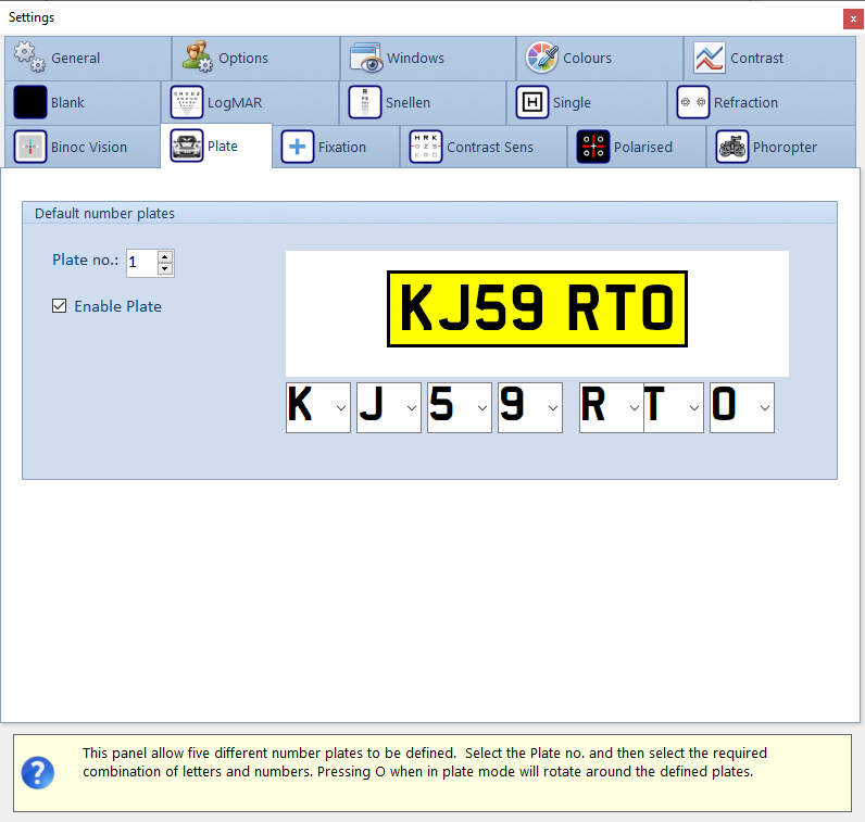 The Plate tab of the Settings window allows the user to set the default letters/numbers shown on the default number plates.