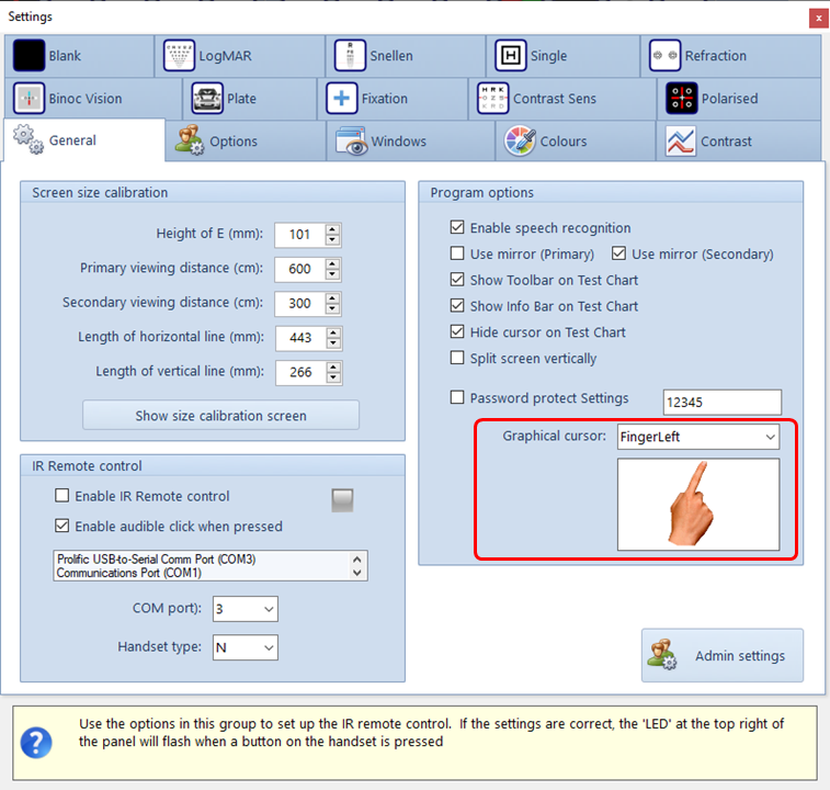 The default pointer can be selected from the General tab of the Settings screen as shown below: