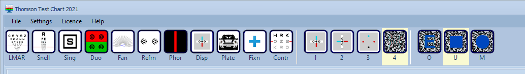 The Thomson Test Chart is capable of generating stereograms of tumbling Es, a square or a circle. When the stereopsis test is selected, the Secondary toolbar is expanded to include 3 more buttons as shown.