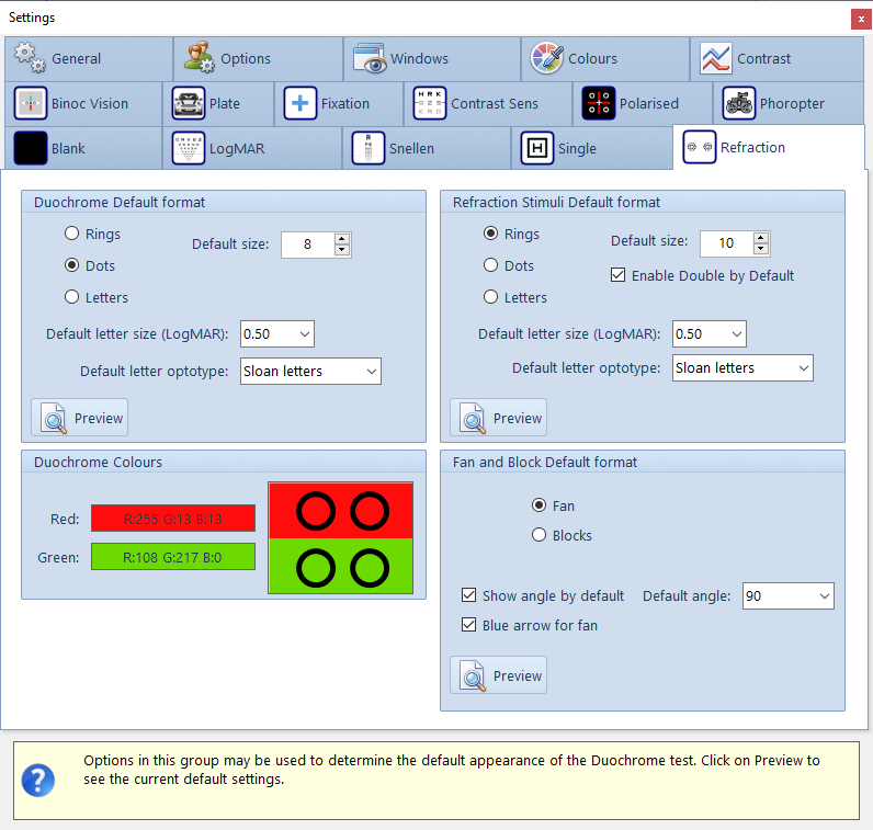 The default format of the stimuli (Rings, Dots or Letters) shown on the duochrome background may be specified. If Rings or Dots are specified, their Default size may also be specified and the user may specify if single or double Rings/Dots are shown by default. If Letters are specified, the Default letter size (LogMAR) and Default letter optotype may also be specified.