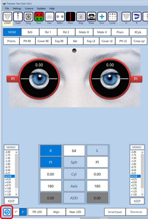 Phoropter Control ModuleUsing the Phoropter Interface Resetting the phoropter To remove all lenses and filters from the phoropter and set the centration to 64mm, click on the Reset button as shown below. The phoropter can take up to 10 seconds to fully reset.