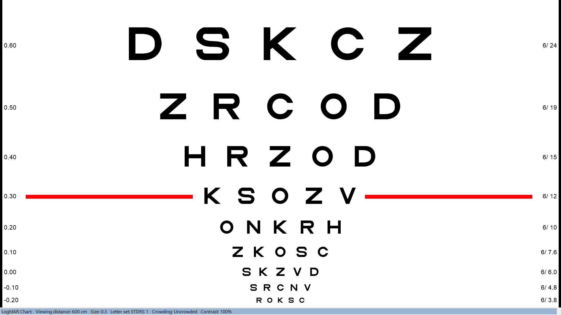 The Current Row is the row of letters that the horizontal markers are currently aligned with (LogMAR 0.3 on screen shown below). The chart may be scrolled one row at a time using the mouse wheel, up/down cursor keys on the keyboard or the remote control handset. The patient is usually instructed to read the Current row.