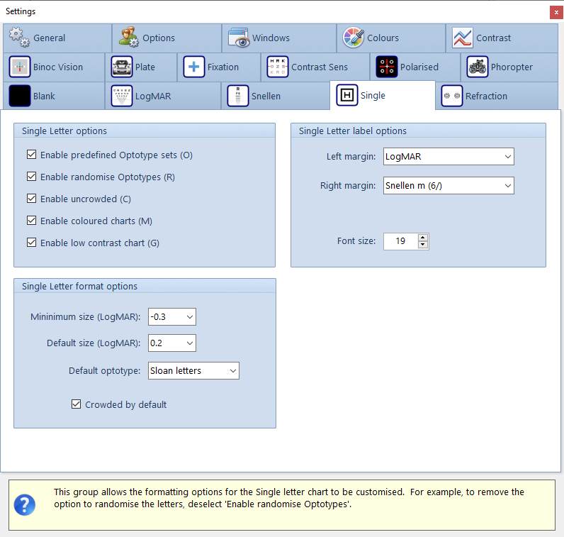 Options in this panel allow the user to specify the Minimum size (Single Letter) (i.e. the smallest Single Letter letters shown on the chart), the default size (i.e. the current Single Letter row after a reset) and the Default optotype (i.e the optotype set after a reset).