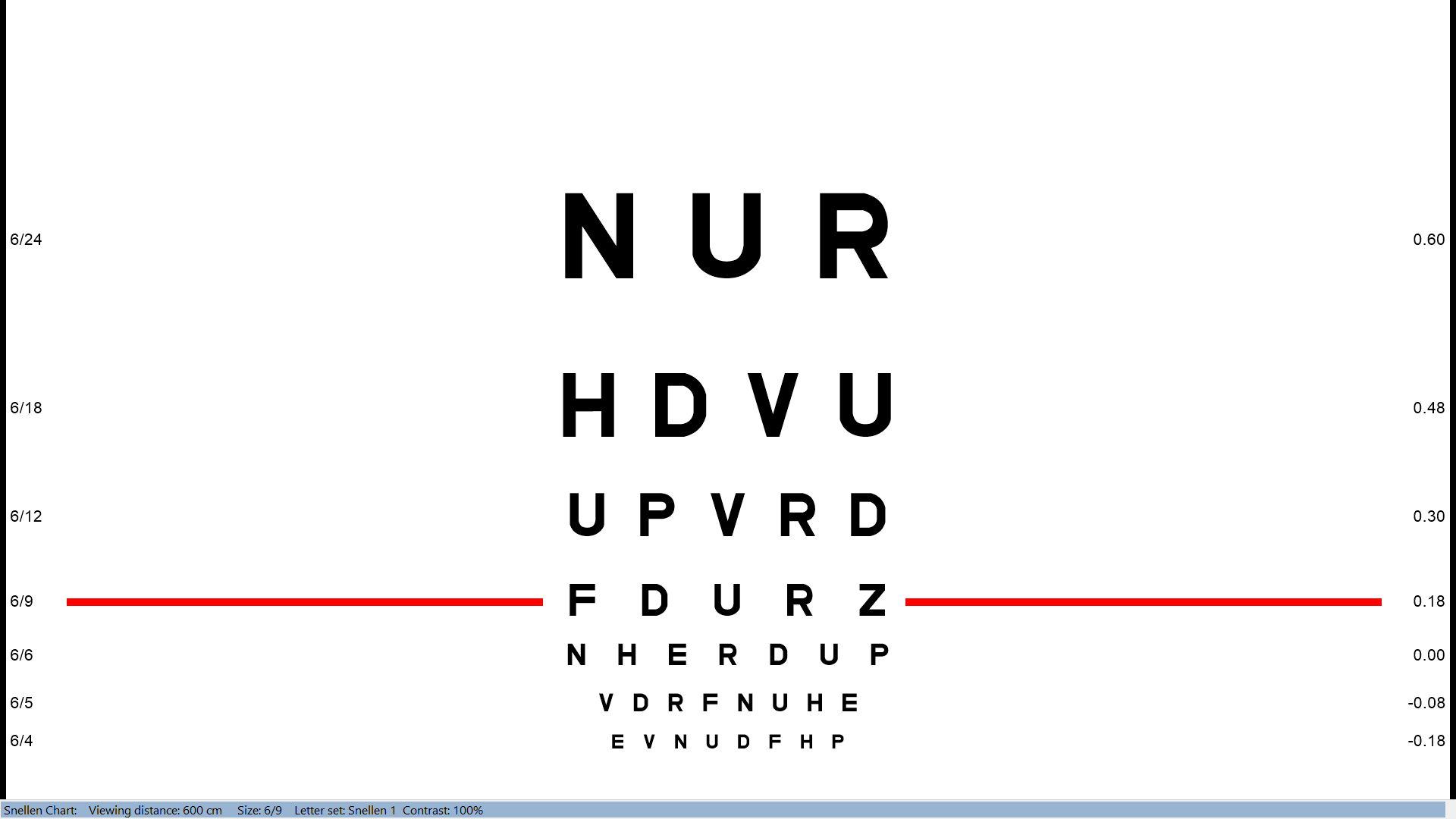 The Snellen chart is displayed by selecting the Snellen icon on the Primary toolbar, pressing F2 on the keyboard of selecting Snellen on the remote control handset. The Snellen chart fully complies with the specifications of BS4724.