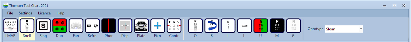The Thomson Test Chart provides a wide range of options for customizing the Snellen chart. These options may be selected using the Secondary toolbar or by using the keyboard or remote control.